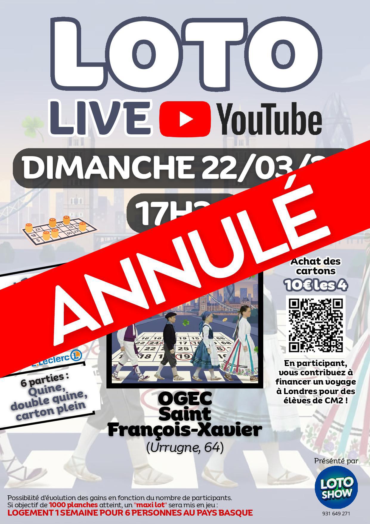 L’équipe du Loto Show vous informe que le Loto Live organisé par l’OGEC Saint François, prévu le 22 mars 2026 à 17h30, est malheureusement annulé pour des raisons propres à l’association.